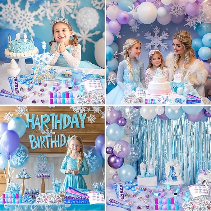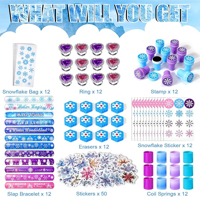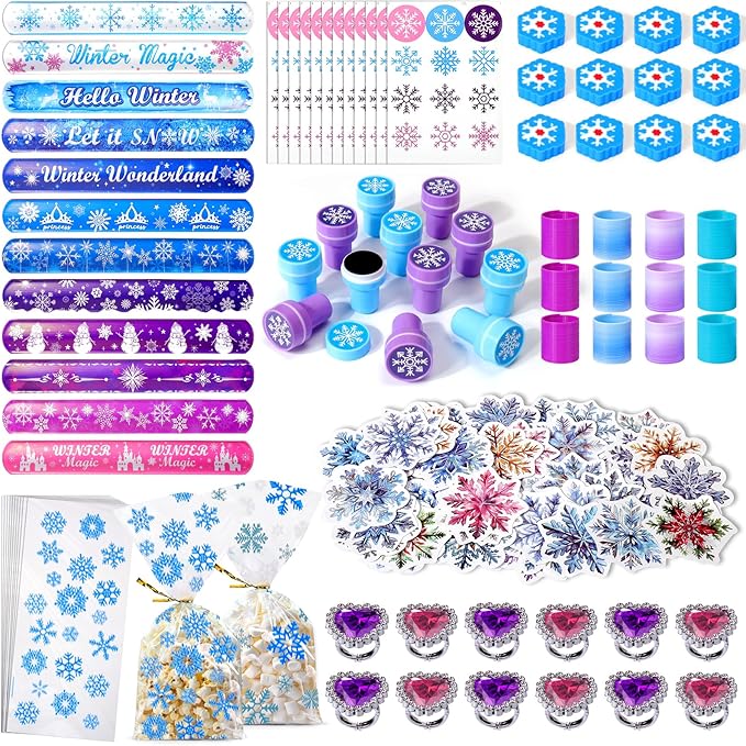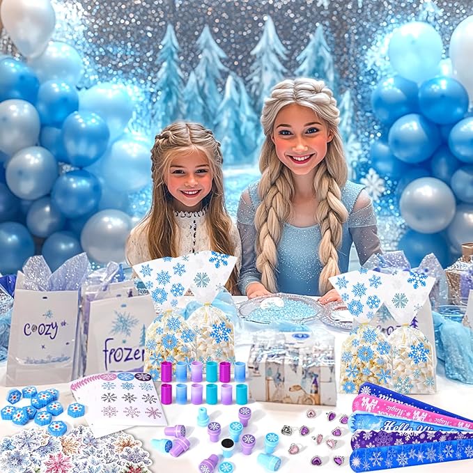 - DIVERSIFIED PARTY DECORATION ELEMENTS: Compared with other single decorations, this frozen birthday party decorations provides you with a variety of essential accessories for Frozen decorations, including rings, fun Slap Bracelets, spring toys, practical erasers, gift bags, snowflake stickers, etc., which you can mix and match as you like to create an unforgettable party experience in an all-around way! Create an unforgettable party experience for you!