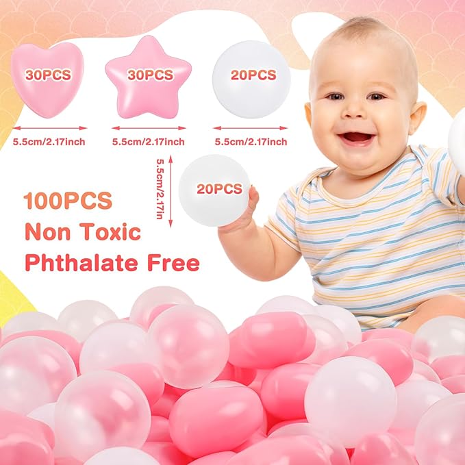 100 Pieces Ball Pit Balls Plastic Colorful Balls for Ball Pit Five Pointed Star Heart Round Ocean Soft Ball 2.17 Inch for Baby Kid Playpen Friendship Party Decoration(Pink White Clear)