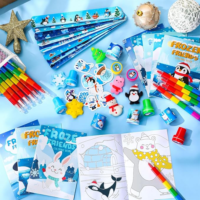 - Polar Animals Theme Gifts: our winter classroom gifts set includes 12 winter coloring books, 12 stress balls, 12 snowflake slap bracelets, 12 colorful crayons, 12 cute stampers and 50 stickers. Students alike will love them for their parties