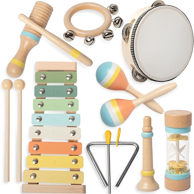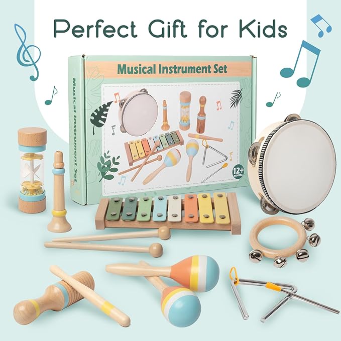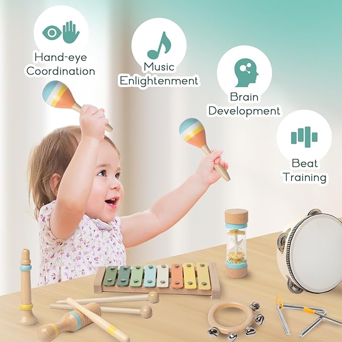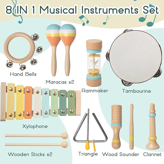 - Wooden Instruments Playset:Our toddlers musical instruments set is designed to cultivate your child's love for music! This toddler music toy set includes 8-tone xylophone with mallets, a tambourine with cymbals, two maracas, a trumpet, a triangle with striker, a wood sounder, a hand bells, and a rainmaker, inviting your little maestro to explore a world of sounds