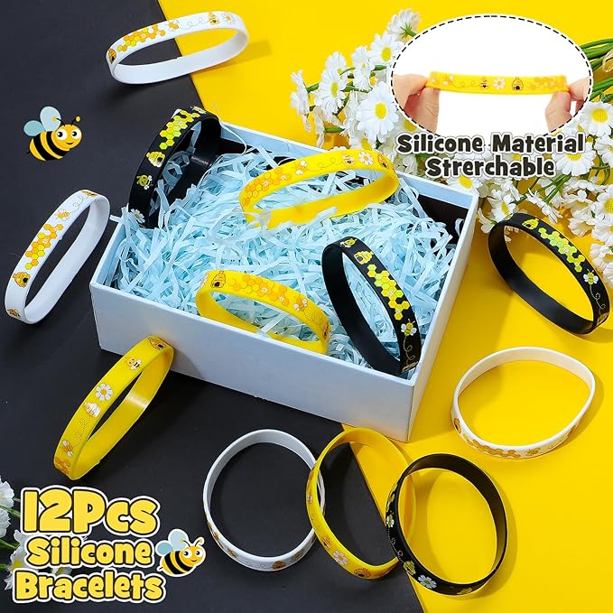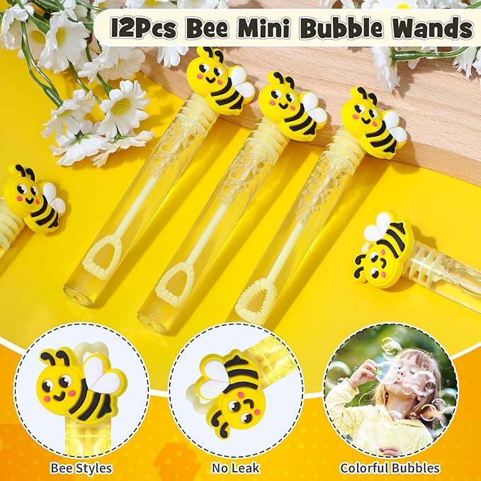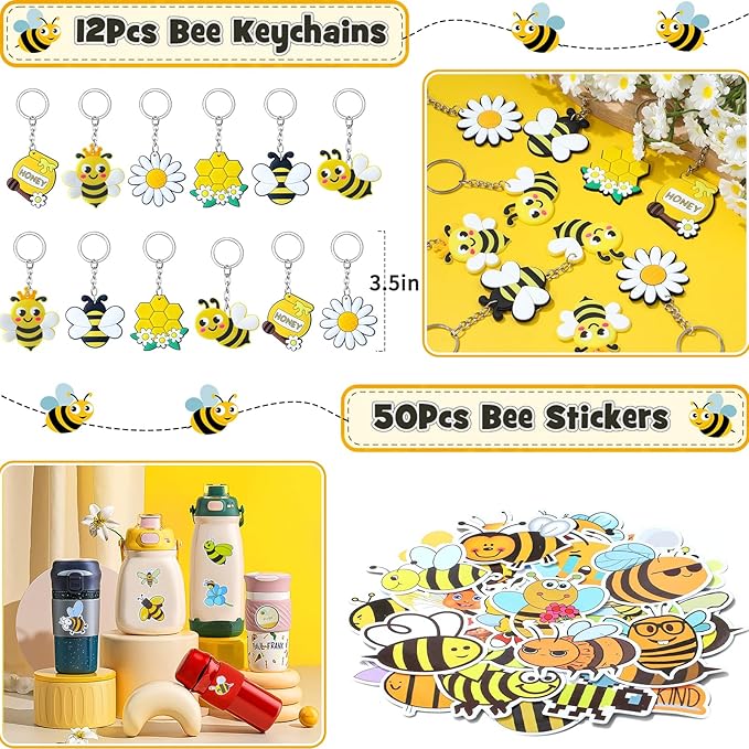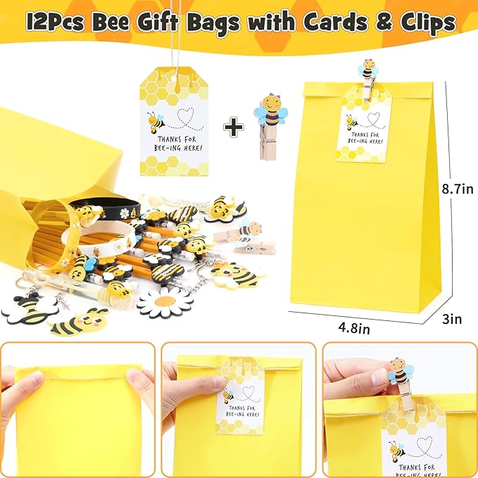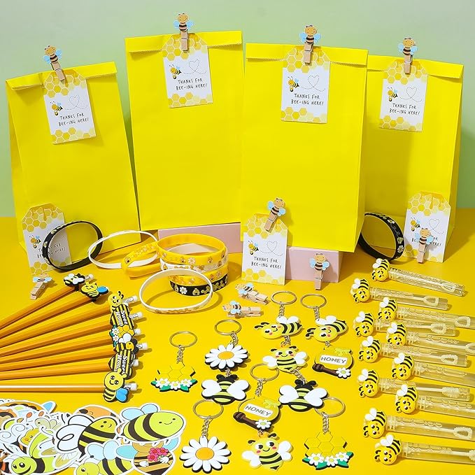 - 146Pcs Bee Party Favors - Welcome to the enchanting world of bee themed party favors, where every item is meticulously crafted to bring a touch of honey-sweet charm to your gathering. You'll get 12 bee gift bags with 12 thank you cards & 12 wood clips, 12 yellow bee pencils with 12 bee silicone patches, 12 bee honeycomb silicone bracelets, 12 bee mini bubble wands, 12 bee keychains, 50 bee stickers. This is a rich set of honey party favors, enough to help our kids celebrate a bee party