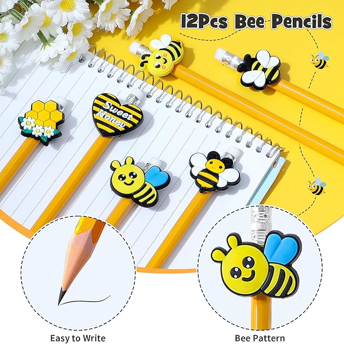 - Sweet Bee Design - Our party favors come in bright and lively colors and are filled with bee elements such as bees, honey jars, honeycombs, daisies and more. Each yellow gift bag comes with a thank you card and a wooden clip. You can put the thank you card on the seal and clip it with the wooden clip to make a different bee gift bag. The pencils come with 6 kinds of bee pattern patches, which make your pencils more cute and interesting, and make your children's homework less boring