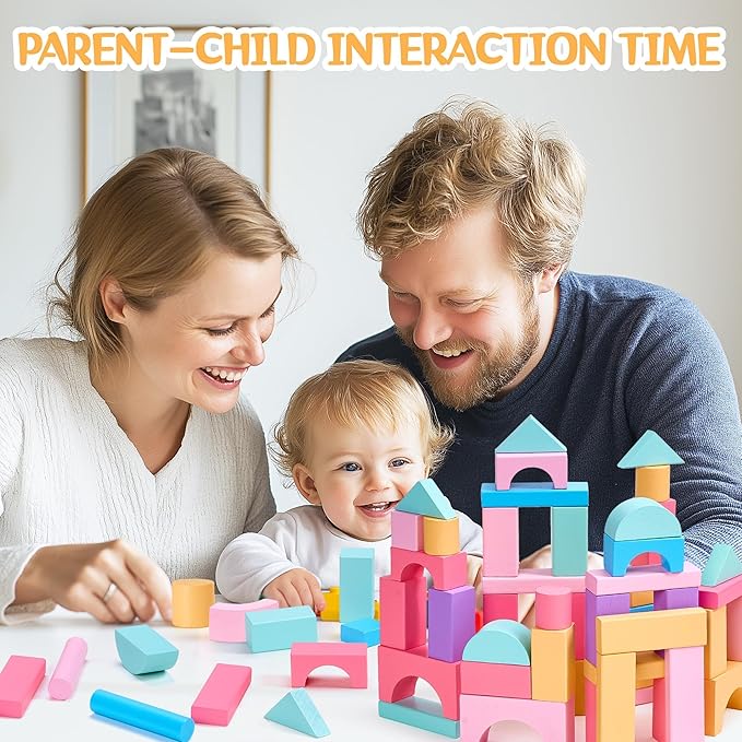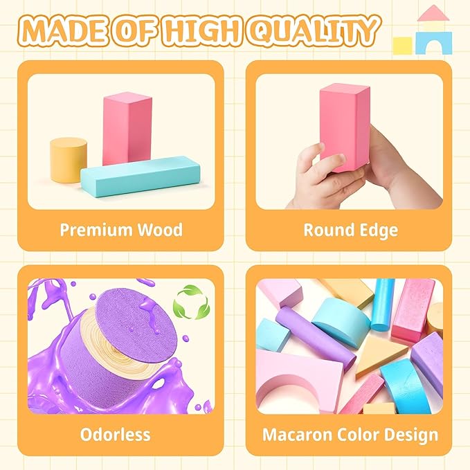 - Educational Fun & Early Learning Tool: More than just a toy, these blocks are Montessori early learning tools. Through block play, children can enhance their color recognition, shape matching, stacking, and sorting skills while stimulating their imagination. The variety of block shapes encourages creativity and cognitive development, helping them improve balance and problem-solving abilities