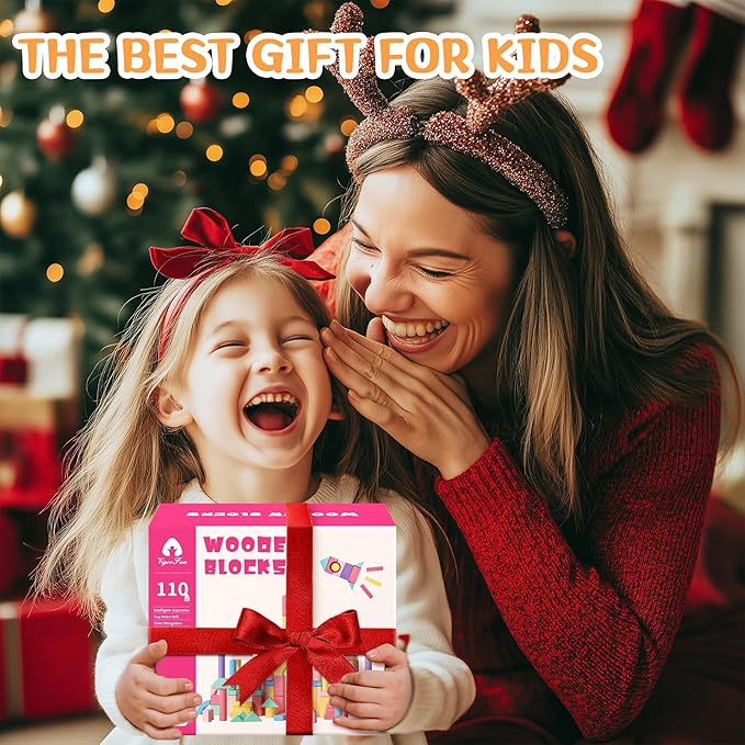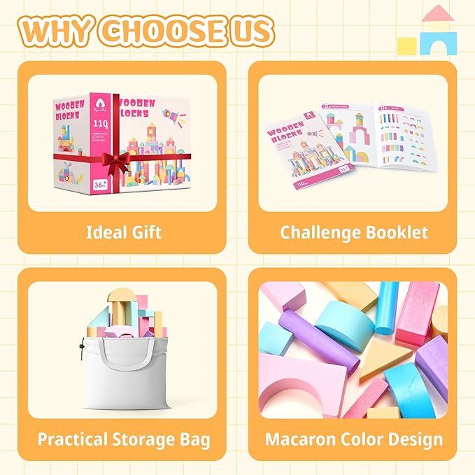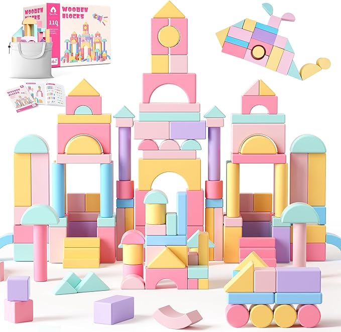 - 110 PCS Wooden Block Set: This 110-piece block set features 15 shapes and 6 colors, comes with a storage bag and instruction manual. The unique macaron color design bringing a brand new visual experience into the classic building block game, making it both aesthetically pleasing and durable. It serves as both a toy and a learning tool for preschoolers, making it an excellent choice for supporting children's growth
