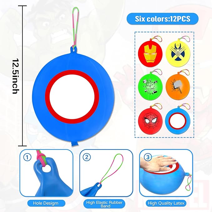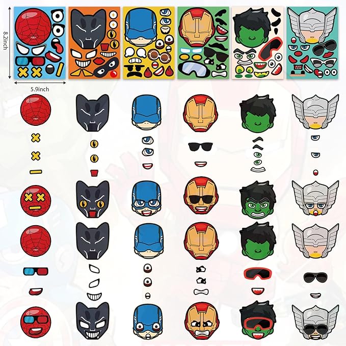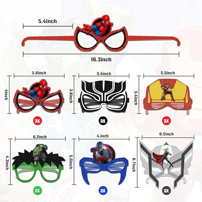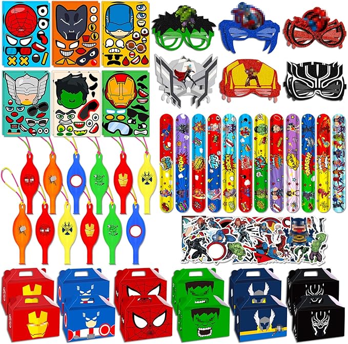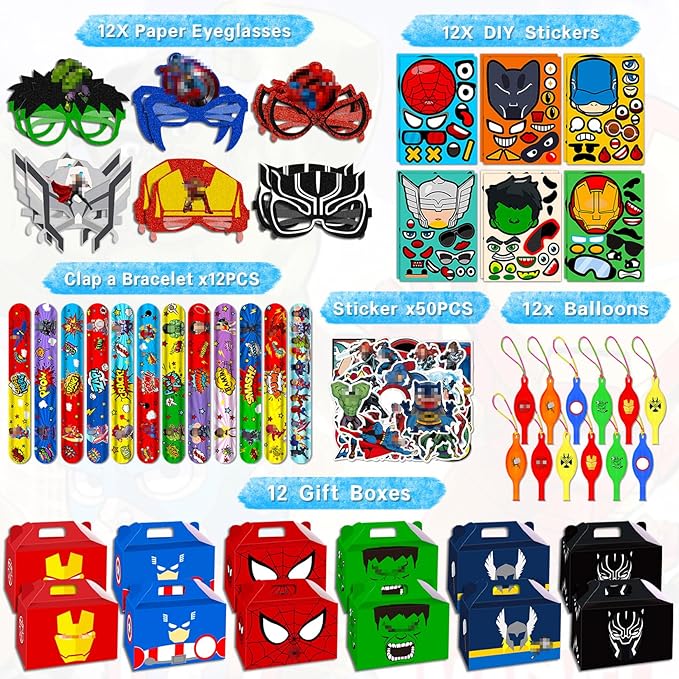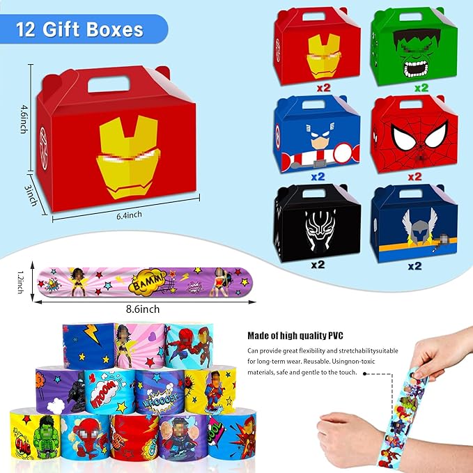 - Super Valued Package of Bulk superhero Toys: 12 Superhero gift boxes, 12 slap bracelets, 12 balloons, 50 random superhero stickers, 12 paper party glasses, 12 make a superhero face stickers, Ideal presents and perfect party favors for kids in celebrations with superhero theme