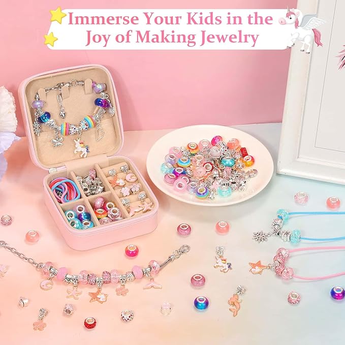 - Exquisite Girl Jewelry Set - The charm necklace making kit contains various styles of beads, charms and pendants, mermaid, rainbow, fairytales, and other styles, all the colorful jewelry beads and cute pendants can be freely matched to create a unicorn bracelet and mermaid crafts for girls.