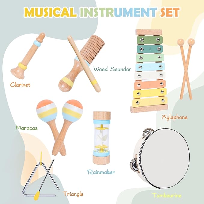 - MUSICAL INSTRUMENT SET: This wooden toy set includes a tambourine, xylophone, wooden sounder, rainmaker, triangle, clarinet and two maracas. Our instruments are designed for children who love Montessori instruments and with this set your child will be able to create enchanting melodies and explore the world of music with joy and excitement.