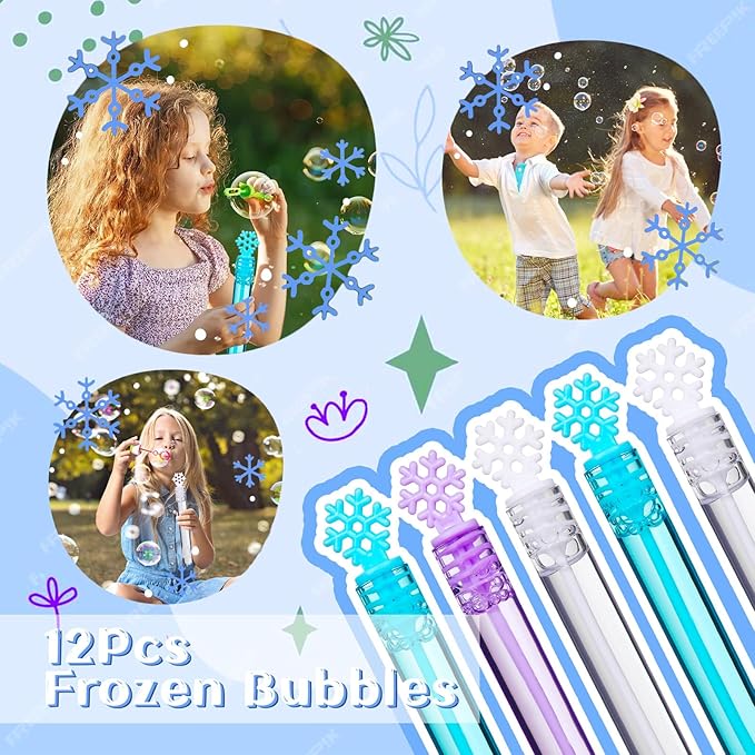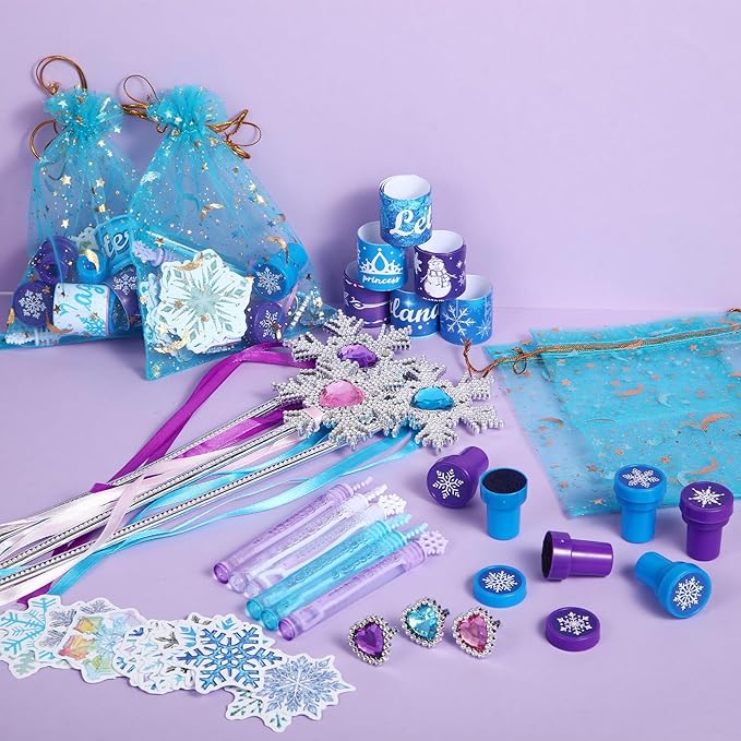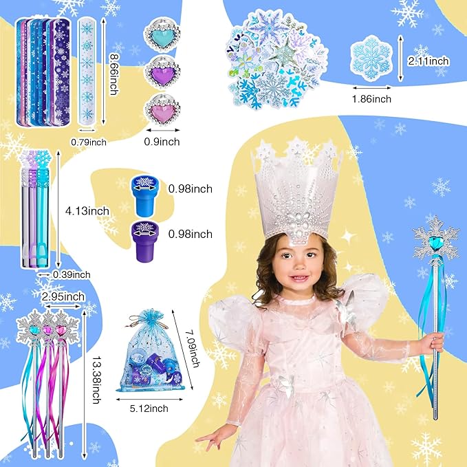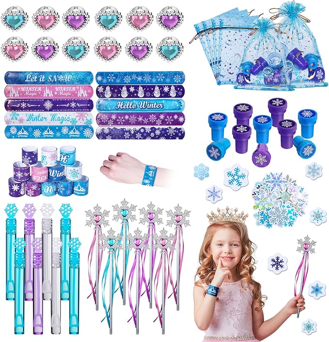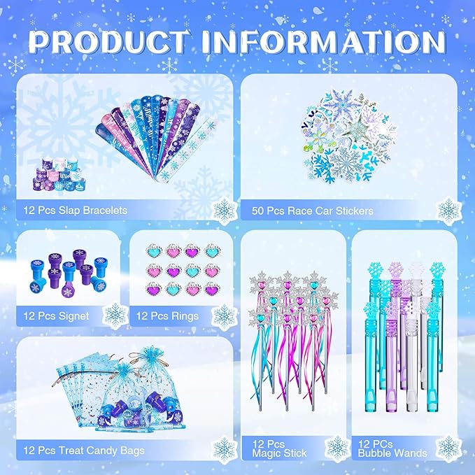- Perfect Frozen Themed Party Decorations: Our Set includes 12 goodies bags,12 slap bracelets,12 diamond rings,12 princess crown wands,12 frozen stampers,12pcs bubble wands and 50 stcikers.The vibrant and detailed designs will bring the magic to your party.