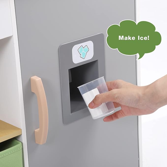 - Realistic & Interactive Features: The new model stove brings the kitchen to life with realistic sound and lights activated by button controls. The ice maker dispenses ice cubes at the press of a button, adding to the fun. A built-in chalkboard allows children to record and display recipes, giving them a true cooking experience with all the features of an adult kitchen, including an oven, microwave, faucet, and removable sink.