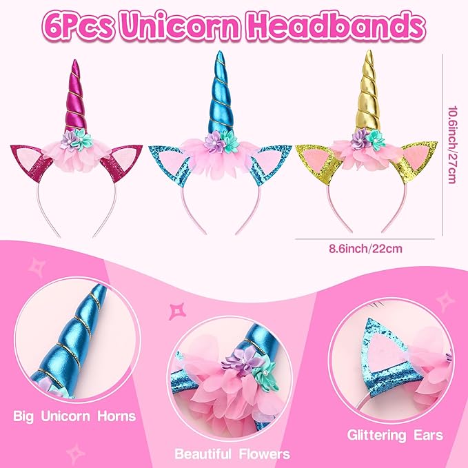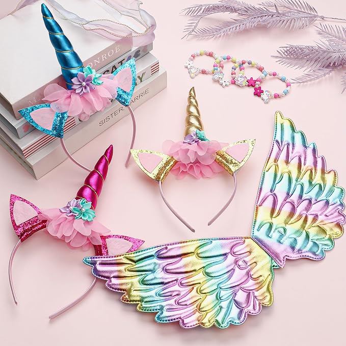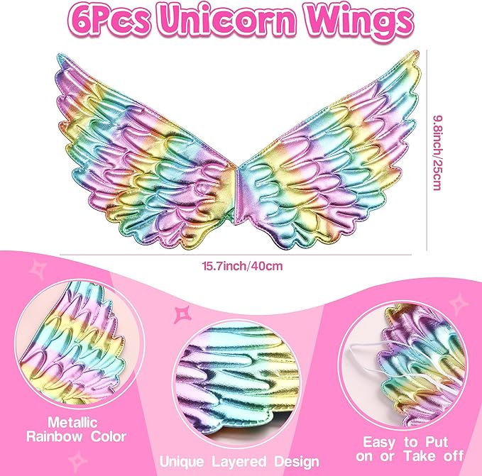 - Girls Unicorn Party Favors - You will get 6 rainbow unicorn wings, 6 unicorn horn headbands (3 colors) and 6 unicorn bracelets (6 types). Dive into the realm of fantasy and sparkle with our unicorn birthday party favors, the great ensemble for Halloween, costume parties, or any magical occasion where you want to shine bright! These unicorn birthday party supplies will make our girls dress up like princesses. Kids and adults alike will love