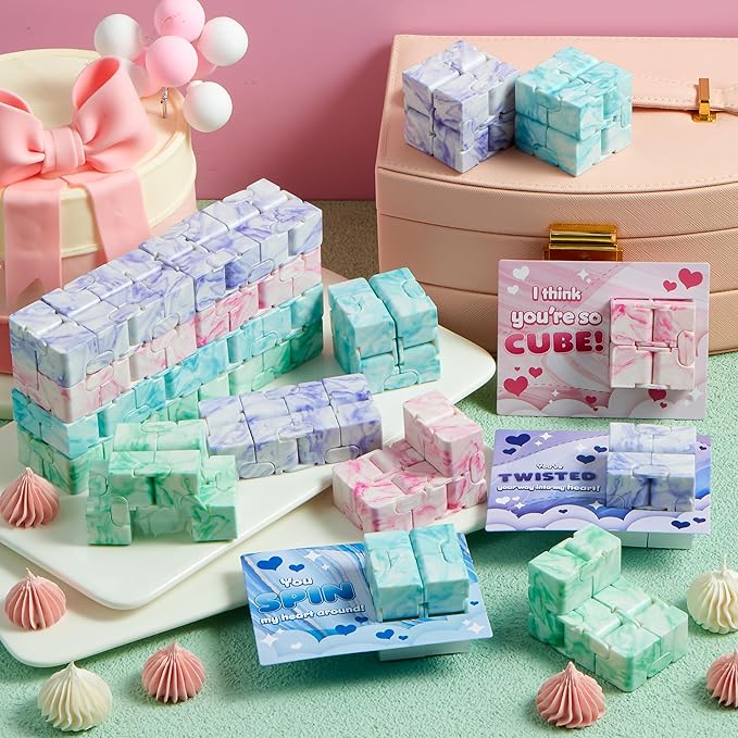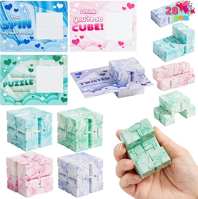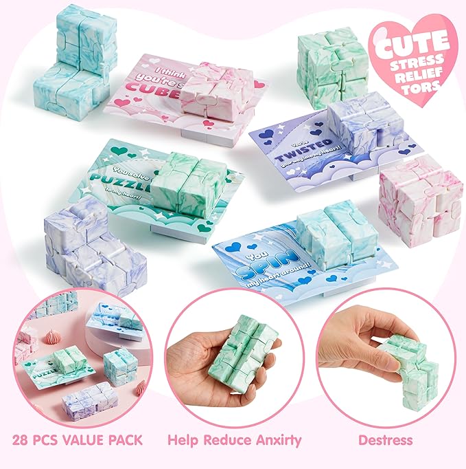 - COMPLETE VALUE PACK: Includes 28 colorful cube fidget toys with 4 unique card designs for endless fun.each paired with thoughtfully love note gift cards as an immersive gifting experience for kids during the love-filled season.