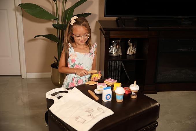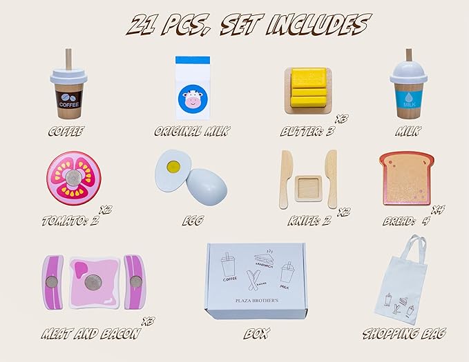 - Complete and Realistic - Includes bread slices, coffee cups, milk cup, butter, egg, bacon, ham, tomato, milk bag, wooden knives, all stored in a practical cotton bag, realistic cooking experiences, imaginative play
