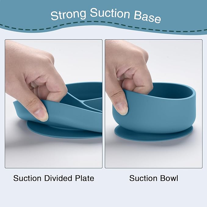 - 【Suction Plate & Bowl】 Designed to make mealtime easier and less messy.These baby plates have three divisions and the bottom suction cup design attaches securely to a flat surface, preventing the toddler plate from being thrown or tipped over. The dividers help to separate food and the raised edges make it easier for baby to scoop food from the plate.