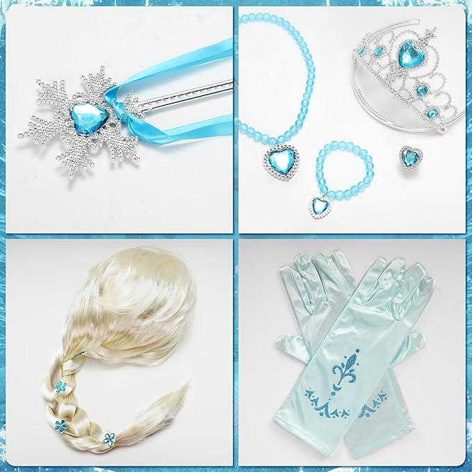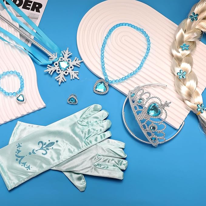 - CARTOON PRINCESS DRESS SET - Elegant sparkling snowflake design on our blue princess dress, shiny tulle top, rich luxury accessories, wigs, tiaras, magic wands, princess gloves, necklaces, bracelets, earrings and rings, full princess dress up to take your little princess into the magic kingdom