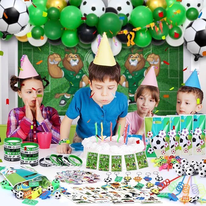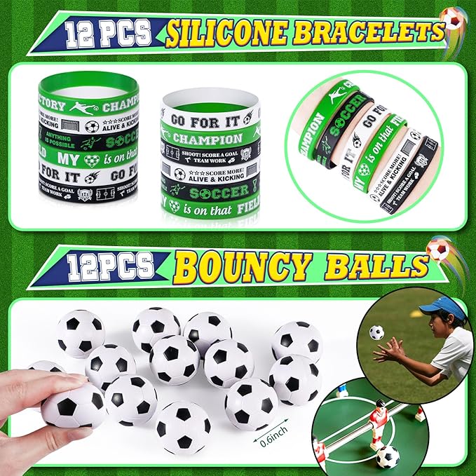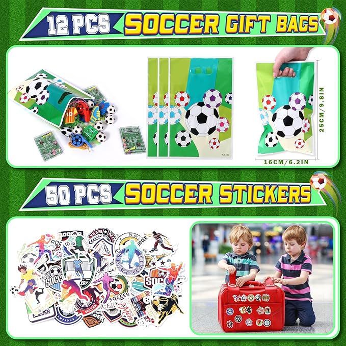 - 146Pcs Soccer Birthday Party Favors: We have carefully prepared a set of soccer theme party favors. The set includes 12 soccer straws, 12 bouncy balls, 12 whistles, 12 keychains, 12 silicone bracelets, 12 gift bags, 12 puzzle toys, 12 tattoo stickers, and 50 soccer stickers. The rich set can not only help you entertain 12 children, but also help you hold a grand soccer party