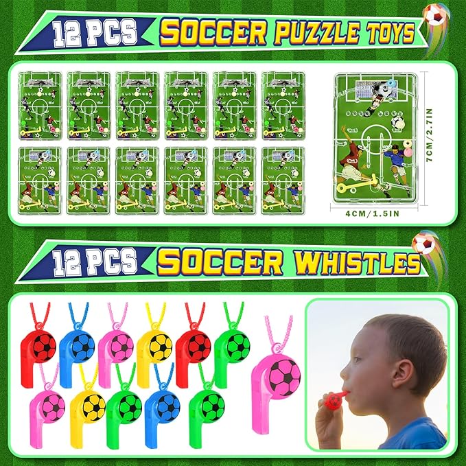 - Go Soccer Party: We've prepared 9 different funny soccer gifts for soccer fans. Kids can drink from straws, give each other gifts in bags, decompress with bouncy balls, use whistles to join games, and have fun with puzzle toys. Accessories like bracelets, keychains, and stickers can be used as everyday accessories. It's the perfect addition to soccer birthday party decorations