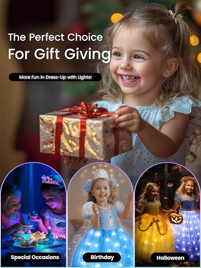 - No Assembly Needed ---> UPORPOR's princess dress features built-in hassle-free LED lights. No installation needed—just unwrap and let the joy of princess's twirling begin