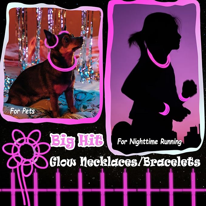 - Eye-catching & Longer Lasting - The glow sticks are brightest for 6-8 hours and then slowly fade away. With these glow bracelets and necklaces, kids, adults and pets will be even more visible and easier to spot while walking around at night. Fun night time party favors to help you steal the show