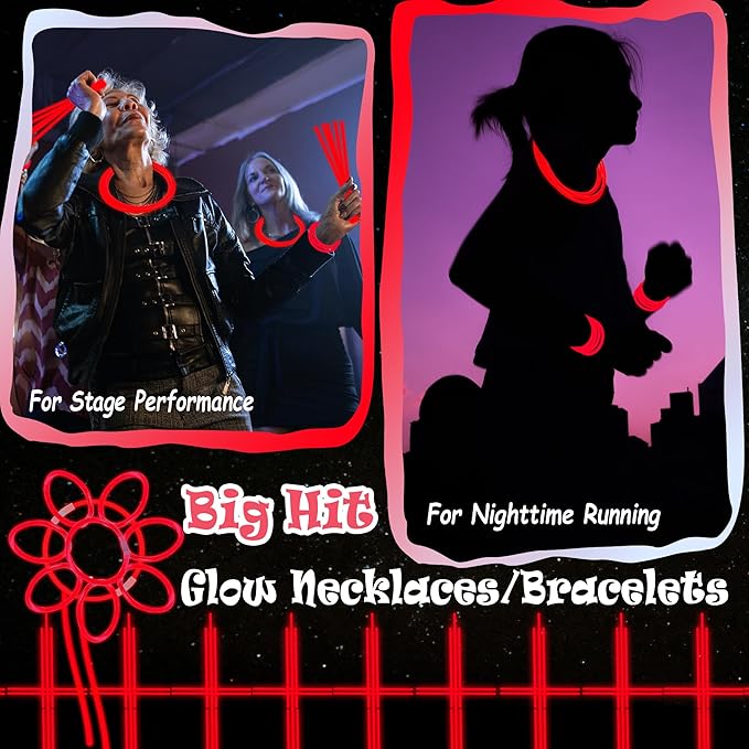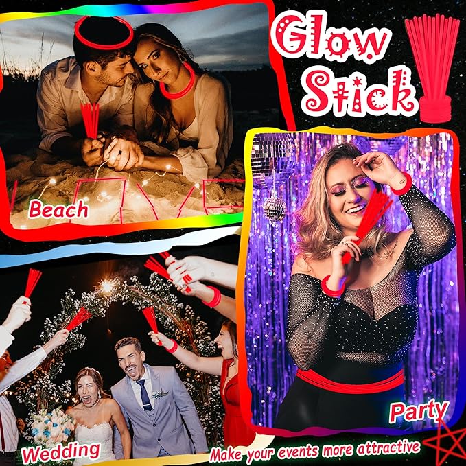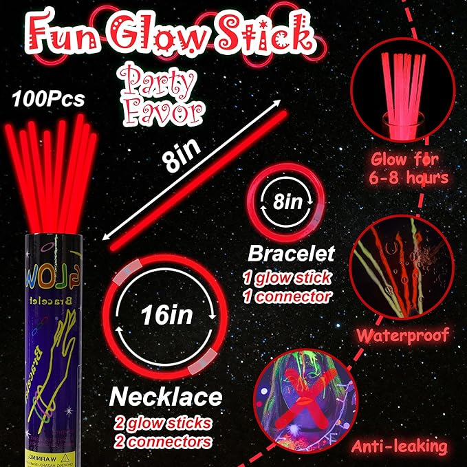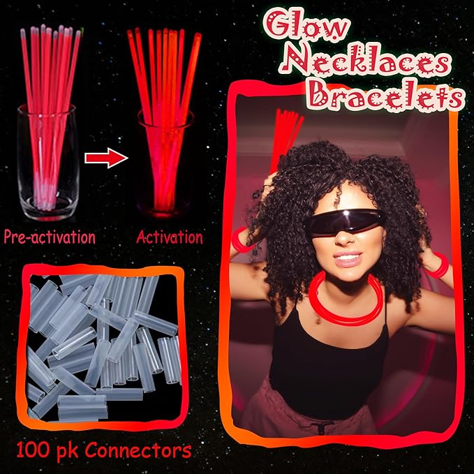 - Glow Sticks Light up Your Night - Our neon glow stickers set come with 100 packs of glow stickers and connectors for making different shapes, such as bracelets, necklaces, headbands and belts. Bend and shake to activate these glow sticks, which are a huge hit at the dark night party, easy to assemble and remained colorful for quite a long time