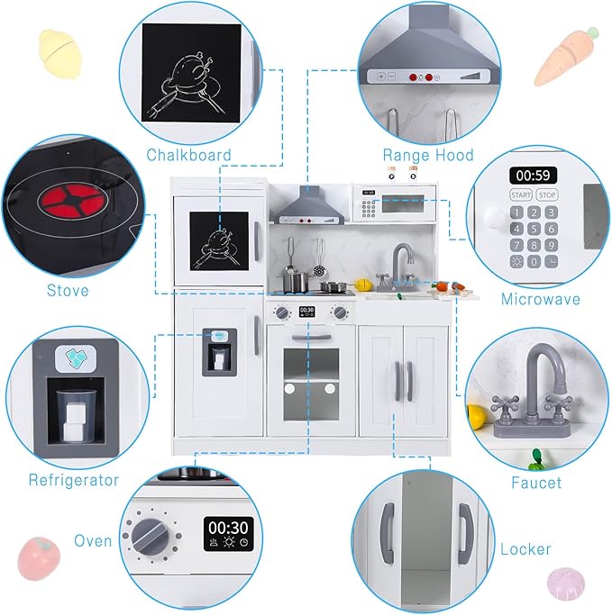 - Interactive & Educational Play: Blends modern home aesthetics with practical storage, helping children cultivate self-organization habits through a unique classification system. Turn on the button of stove and range hood, it will light and make sound like real cooking. Ice cubes drop down when button of ice maker is pressed. Chalkboard will help recor & show recipe. And also the little chef would get endless fun with this oven, microwave, faucet, and sink.