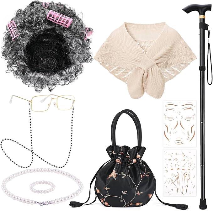 - 【Reliable and Safe】our old lady wig is made of high-quality synthetic fiber, strong and durable;The grandma costume shawl is made from soft, breathable and lightweight fabric.our glasses are made of plastic frames and clear fake lenses which will not change your vision or hurt your eyes.Black cane is made of quality material,sturdy and not easy to fade or break.Handbag is made of quality brocade,convenient and practical.