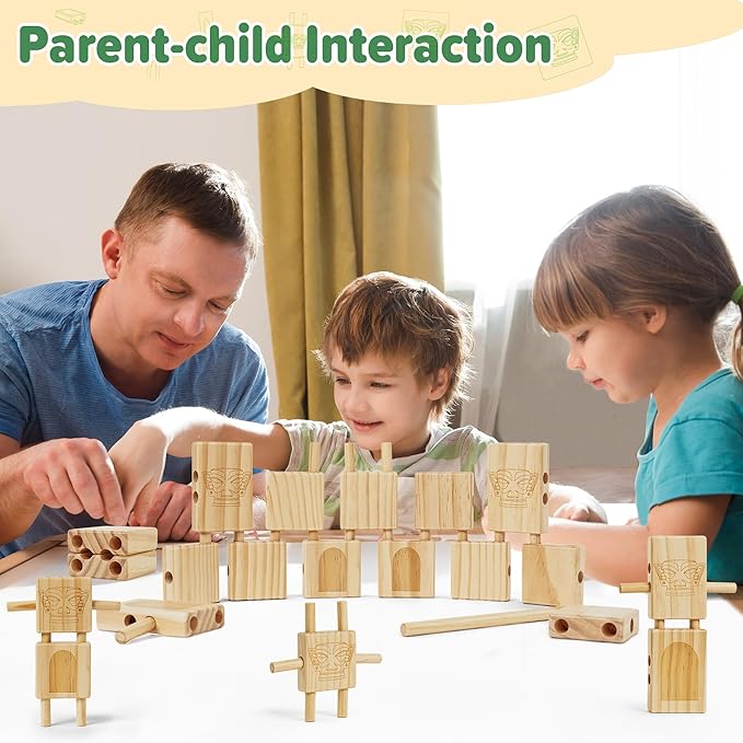 - FLEXIBLE WOODEN BLOCKS & OPEN-ENDED PLAY -These stacking blocks for toddlers 1-3 feature a unique connecting structure, come with holes and round rods that can be easily combined, allowing kids to create a variety of shapes and buildings. Designed with a loose fit to avoid overly tight connections, these blocks allow toddlers 12+ months to build flexibly, enhancing the fun of stacking and building. These building blocks for toddlers 1-3 are designed to promote hands-on, open-ended play